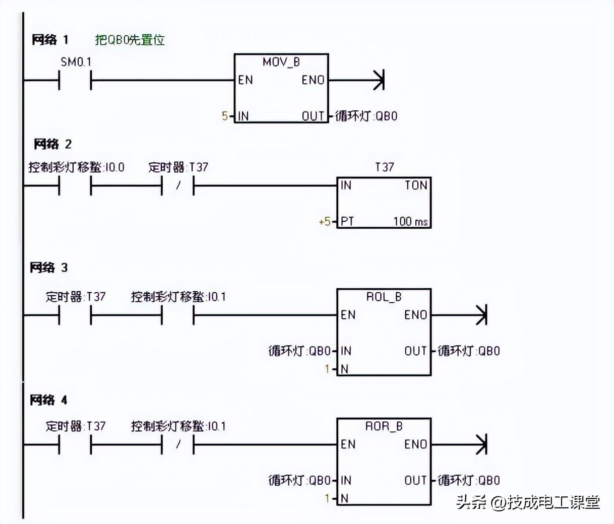 用IO导线控制接在Q0.0到Q0.7上的八个彩灯循环移位,用t37定时,每0.5S移位一位,首次扫描时给Q0.0到Q0.7置初值,让Q0.0和Q0.2先有输出。用I0.1来控制彩灯位移的方向。