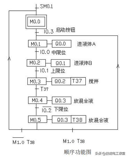 当按下在线控制面板上的I0.03f 即(I0.3闭合)阀A打开(即Q0.0亮),当按下在线控制面板上I0.0f(即I0.0中限位闭合)阀A关闭,阀B打开(即Q0.0灭,Q0.1 亮)当按下在线控制面板上I0.1f(即上限位I0.1闭合)此时阀B关闭,电动机启动开始进行搅拌,(即Q0.1灭,Q0.2亮)同时定时器T37开始定时一分钟,一分钟后搅拌机停止搅拌,阀C打开(即Q0.2灭,Q0.3亮)当液位到达下限位后阀C继续打开(即Q0.3亮)同时定时器T38开始定时。5s后阀C关闭。阀A打开,(即Q0.3灭,Q0.0亮),进入下一个循环周期。按下在线控制面板上的I0.4f(即表示停止的I0.4闭合)此时系统不会立即停止,而是当运行完一个周期后才停止。