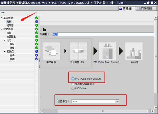 脉冲控制就要选择PTO,“位置单位”根据需要选择,如果选择“mm”,就是在实际使用中控制电机运动按照距离计算定位,如果按照角度计算定位,则选择单位度。