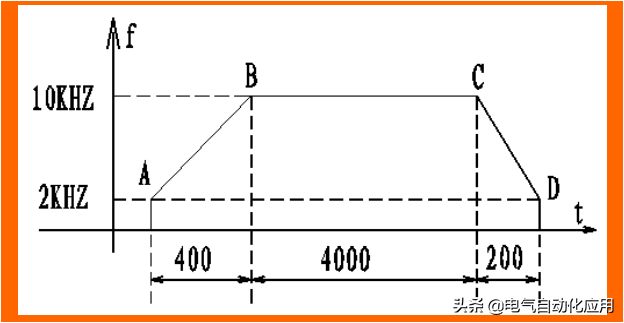 已知步进电机的起动频率为2 kHz(A点),经过400个脉冲加速后频率上升到10 kHz(B点和C点),恒速转动的脉冲数为4000个,减速过程脉冲数为200个,频率降为2 kHz(D点),其频率特性如图所示。