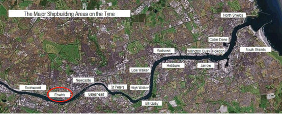 泰恩河下游曾经船厂云集,图中标注处就是埃尔斯维克船厂