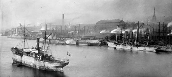 1904年鼎盛时期的埃尔斯维克造船厂,右侧尖顶的圣史蒂芬教堂至今仍在