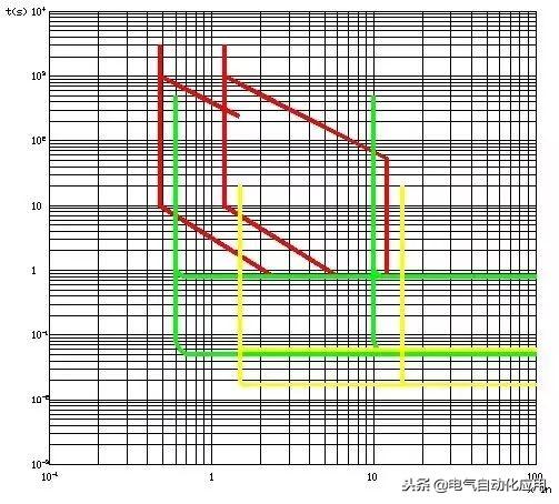 这是我图库中预先保存的断路器时间电流特性曲线坐标图的图块,一旦需要,立即调出,然后用属性块自动绘上保护参数曲线。下图中已经绘上了断路器LSI保护参数特性曲线: