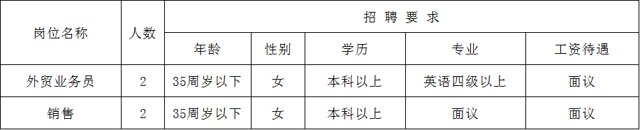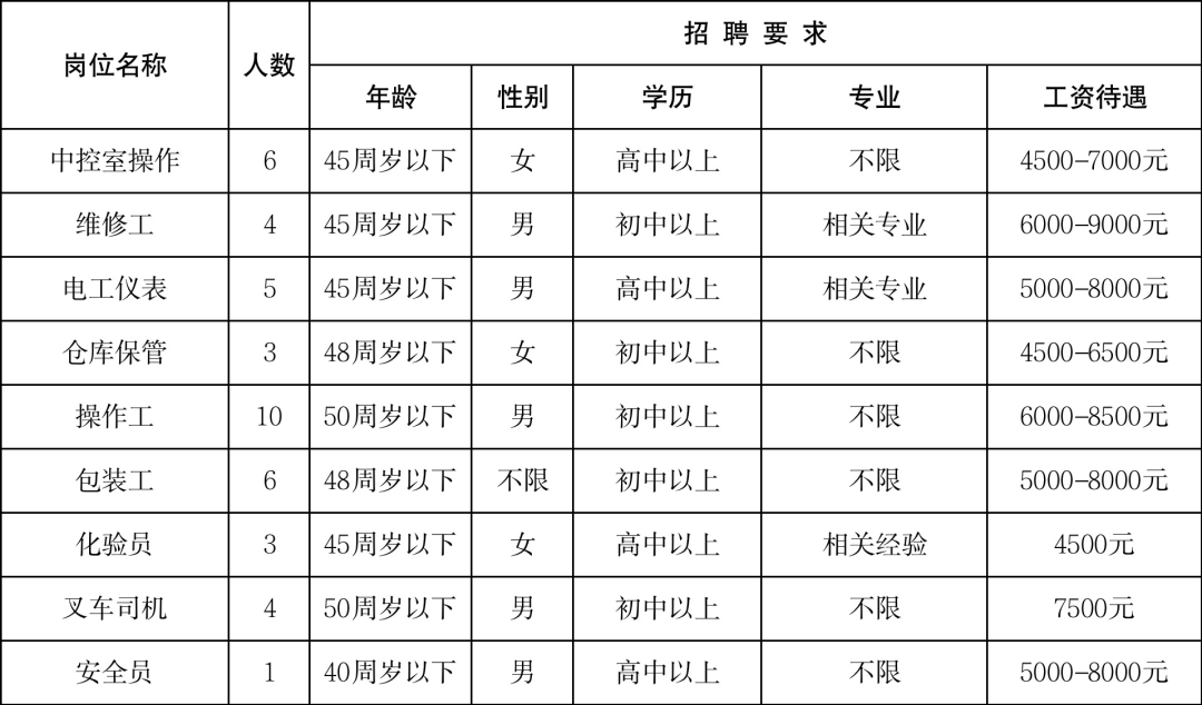 打包工(可短期计件)、操作工、统计员、检验员、警卫。