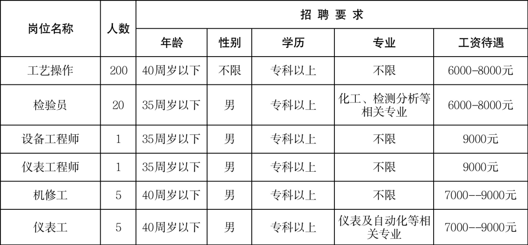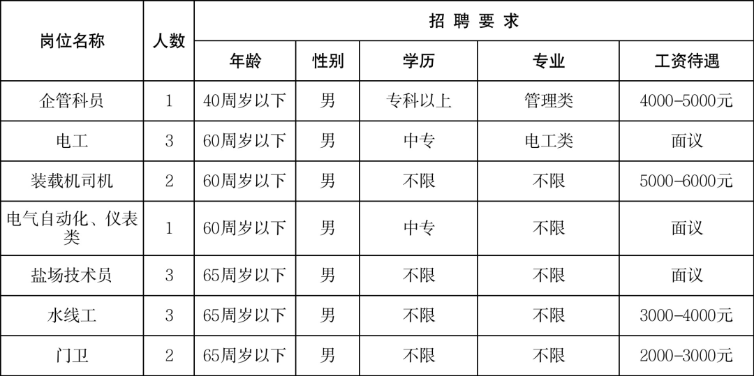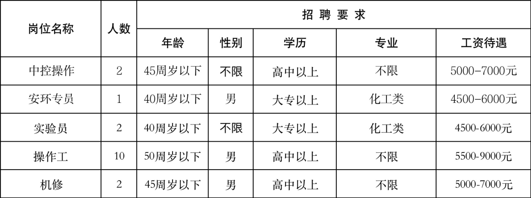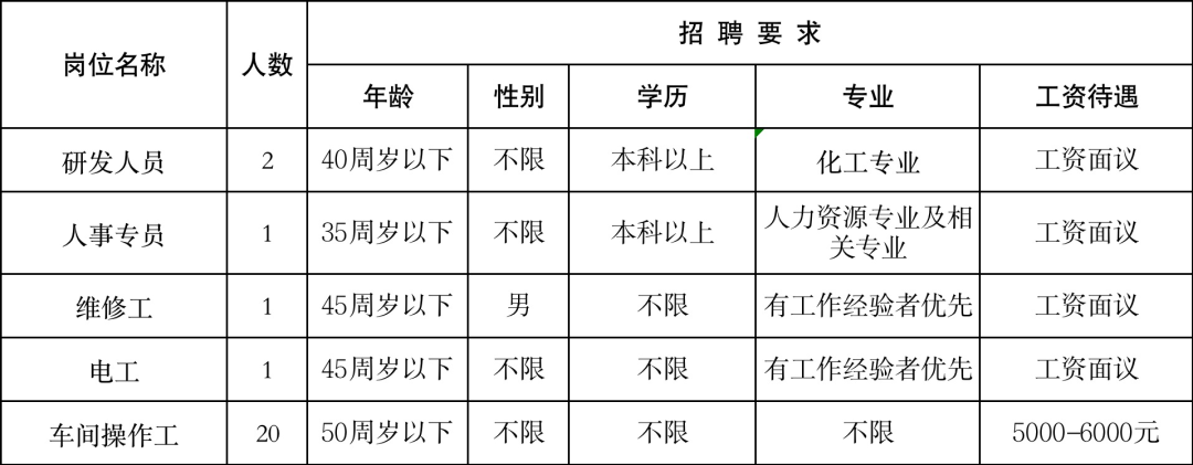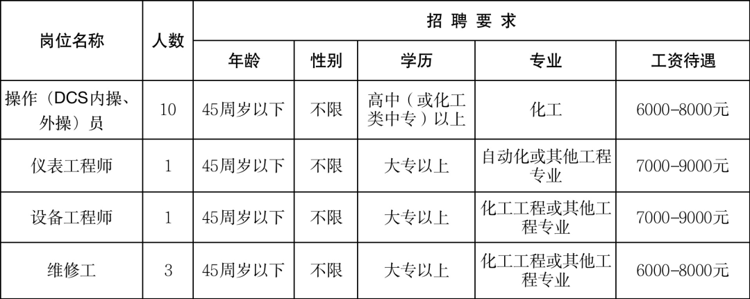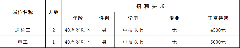 2、电仪工1名,男,年龄40周岁以下,高中(中专)以上学历,有相关工作经验者优先,长白班,工资面议;