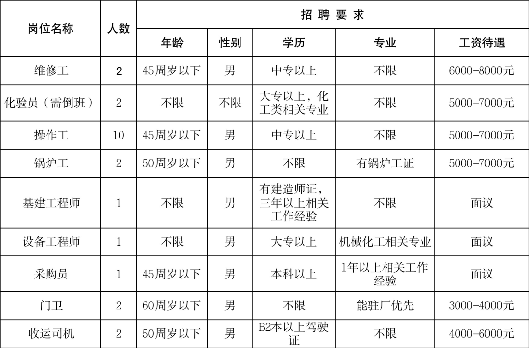 3、操作工4名,男,年龄40周岁以下,高中或者中专以上学历,三班倒(上12休24),工资6000-7000左右。