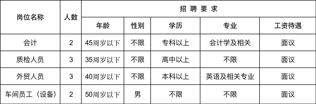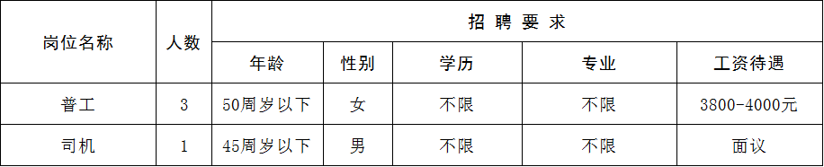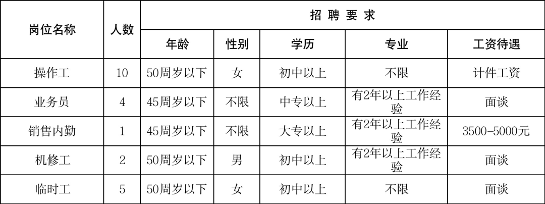 1、机修1名,男,年龄45周岁以下,有相关工作经验者优先,长白班,工资面议;