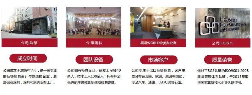 深圳市品成金属制品有限公司成立于2009年7月,是一家专业的压铸模具设计与制造的企业,总部设在深圳,深圳和东莞设有工厂。公司以为客户提供压铸模具的整体解决方案为宗旨,提供的产品和服务包括:压铸件的设计优化、预算方案的分析、概念产品首版、快速实验模具、正式量产模具、配套修饰模具、小批量产品以及模具的保养、维修、更改、翻新等服务。成立至今,已为客户提供了超过4000套的压铸模具。现拥有压铸模具制造和检测相关的主要设备有:CNC、EDM、WEDM、快速夹具、CMM、光学测量仪、合模机、油温机、压铸机等。客户主要分布在美国、加拿大、墨西哥、克罗地亚、英国、法国、德国、意大利、奥地利、瑞典、捷克、丹麦、荷兰、波兰、葡萄牙、澳大利亚、新西兰等国家。