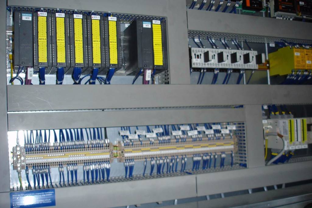 PLC控制着一个复杂系统,所能看到的是上下两排错开的输入输出继电器接线端子、对应的指示灯及PLC编号,就像一块有数十只脚的集成电路。