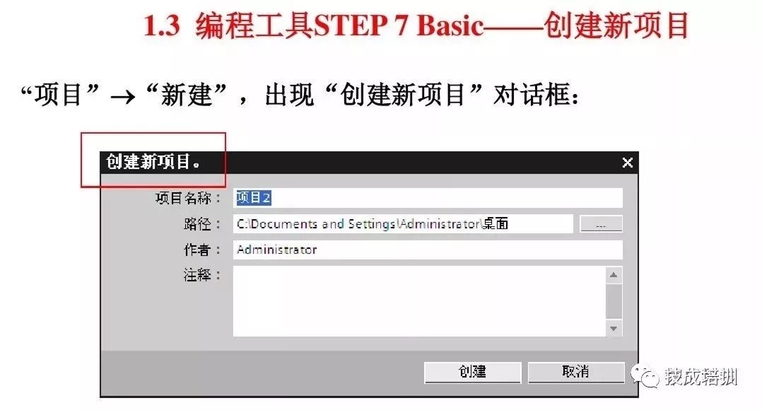 1)打开TIA Portal软件,创建新项目,定义项目名称;文件存放路径;作者;注释等信息,图示: