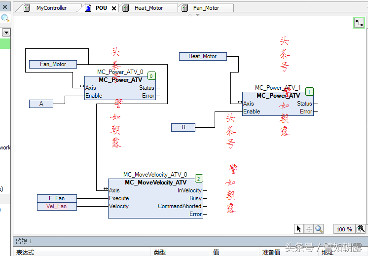 如图三所示,通过MC_MOVEVELOCITY_ATV 来进行速度控制,大家可以看到,它是可以和使能模块共享轴号这个输入引脚的,这就是使用CFC编程语言的好处。当变量E_Fan为TRUE的时候,变频器就会以变量Vel_Fan定义的速度运行。
