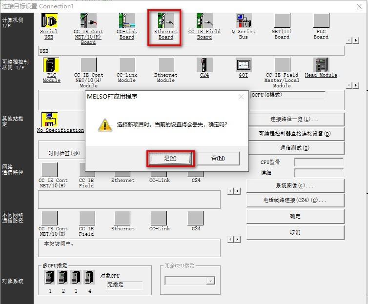 15、进入连接目标设置Connection1对话框,选择EthernetBoard,在谈出来的对话框选择“是”。