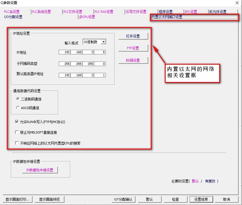 3、通信数据打码设置选择二进制码通信,勾选允许RUN中写入(FTP与MC协议)