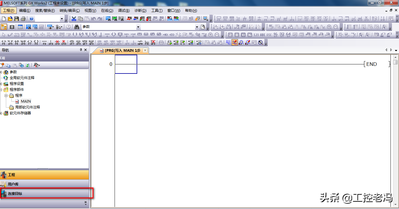 然后我们打开GX2编程软件。新建一个工程,选择与自己PLC对应的系列和型号。再点击左下角的连接目标。