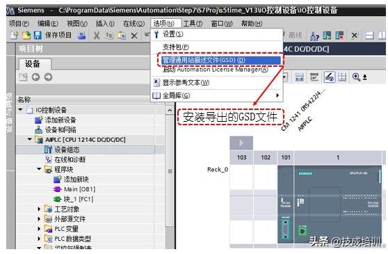 (1)在A号PLC的设备视图的选择中点击“选项”菜单进行GSD文件的安装,把前面导出的GSD文件安装进去,如下图所示:
