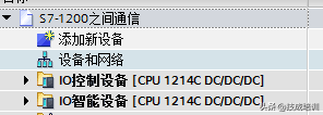(1)在TIA Portal软件中的S7-1200之间通信的项目下添加两个S7-1200的新设备,A号PLC命名为IO控制设备,B号PLC命名为IO智能设备,如下图所示。