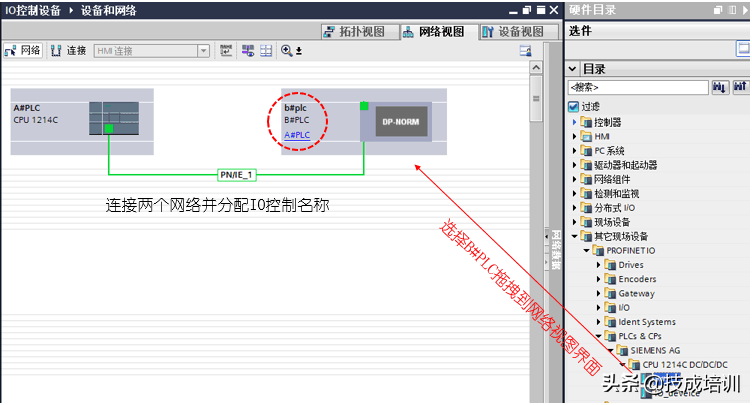 打开网络视图,从右侧的硬件目录中的其他现场设备中的PROFINET IO中找到PLCS&CPS中找到刚导入的GSD的文件的目录,拖拽到网络视图中进行配置。