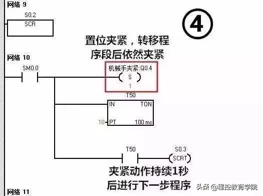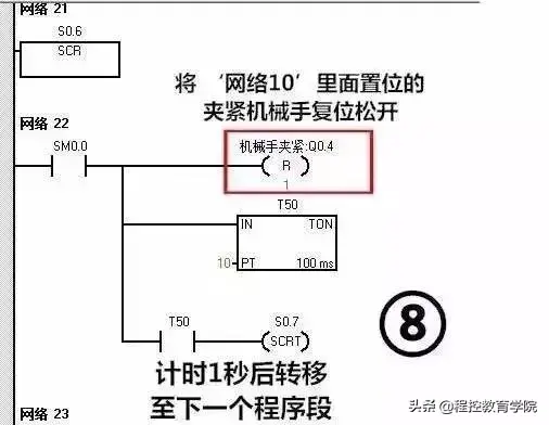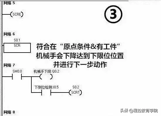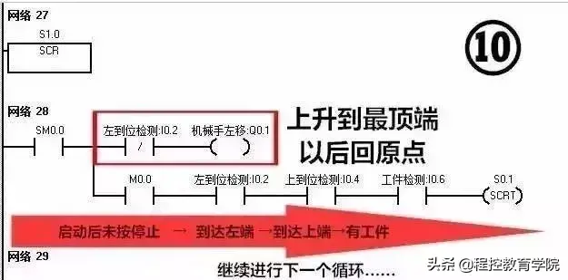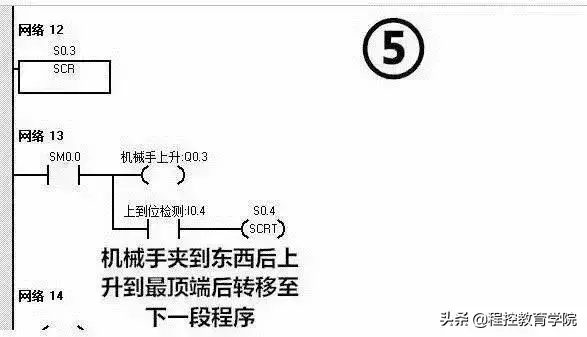 这么多梯形图看着真是头晕目眩,接下来我们一段一段分析分析这个机械手是如何工作 的,其实这个图没有那么多的并行分支,所以转移起来逻辑非常简单!