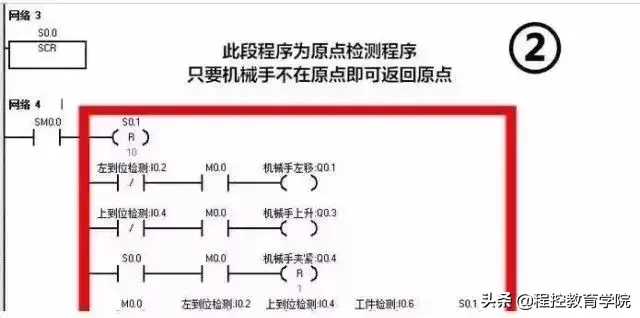原点延时几秒是为了防止人不小心误触掽到原点开关而产生事故。夹抓有料的原点与夹抓无料的原点过程分开编写。以下为回原点程序:
