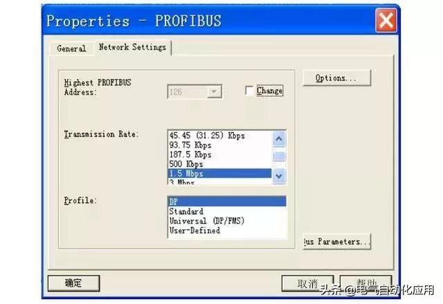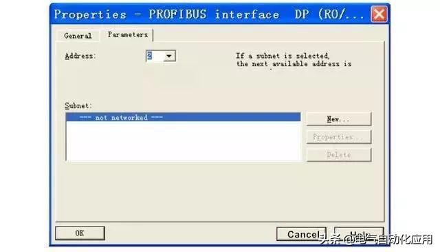 选择“New”新建一条PROFIBUS(1),组态PROFIBUS站地址,点击“Properties”键组态网络属性如下图: