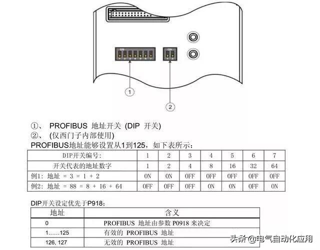 下面介绍两种PROFIBUS总线地址的方法:借助通讯模块的七个DIP开关(如下图所示)或借助P0918