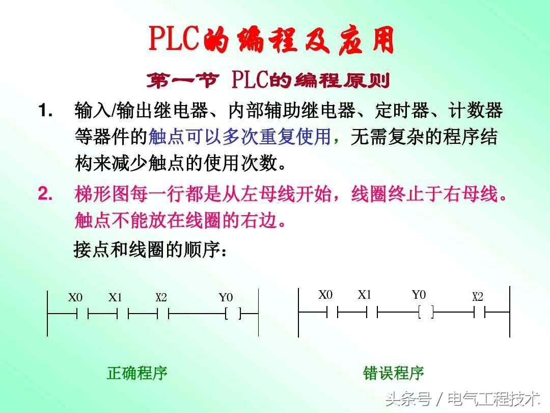 最近很多的电工师傅都留言问:PLC应该怎么学习?PLC编程难吗?有没有什么编程的规范和例子?怎么快速入门学习编程?等等诸如此类的问题,都是PLC初学者经常都会有疑问的地方,老电工师傅都知道PLC的编程,特别是梯形图的编程,是有一定的标准规范的,按照梯形图的编程规范,那么PLC控制程序才可以转换为PLC可以识别的编程语言,这样子PLC才会按照既定的程序进行工况的控制,那么问题来了,PLC梯形图编程的规范是什么?怎么才可以编程出PLC可以正确识别的程序,今天我们就重点来看一下:梯形图编程的原则以及具体的应用实例,希望可以对PLC初学者提供一定的帮助: