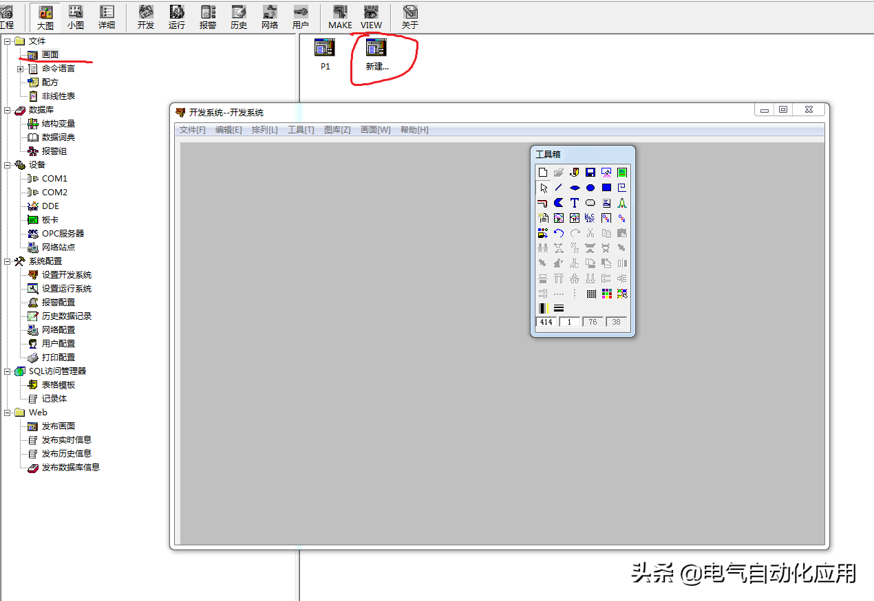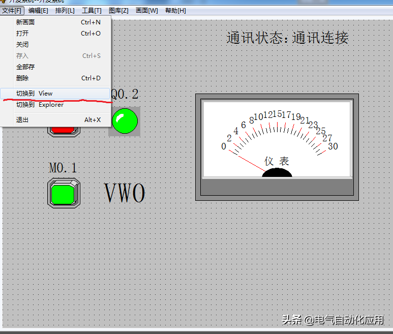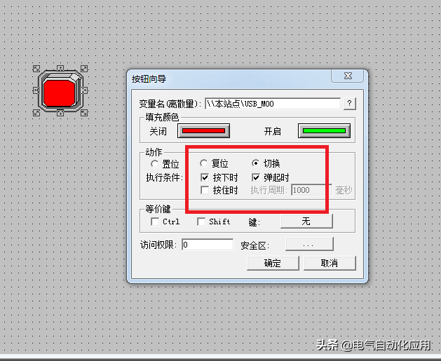 组态好的按钮和指示灯可以通过颜色显示状态之外,还可以通过工具箱的文本用“打开”或者“关闭”的文本标识状态。