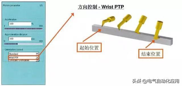 在这个路径运动过程中,工具的方向会从起始点到结束点连续变化,这种方式通过腕部轴的变化把执行运动拆分成若干个PTP运动来执行,这种方式可以避免死角情况发生。