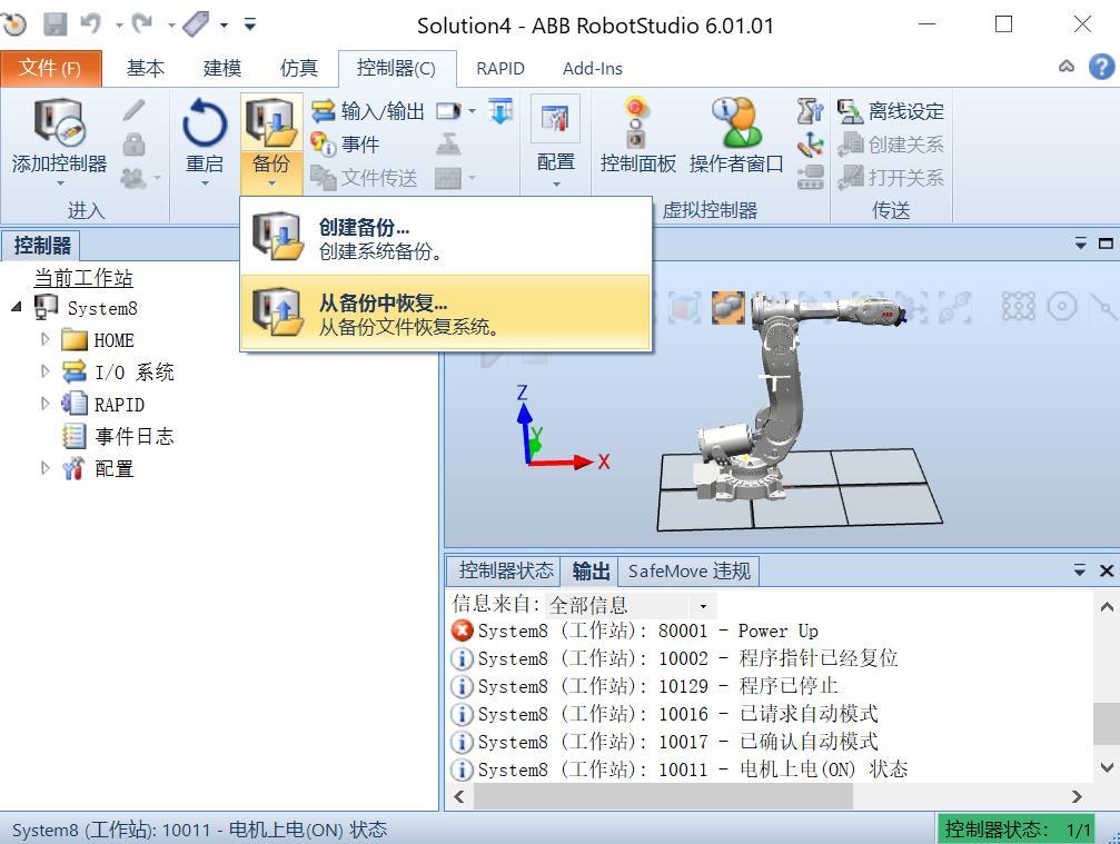 5、上面生成的只是机器人系统,里面没有机器人程序和机器人的配置等信息,接下来我们继续从备份中将这些信息导入到所生成的机器人系统中。点击菜单栏中"控制器-备份-从备份中恢复系统",选择备份的文件夹导入程序和系统配置,此时会提示RobotWare版本不一致,不用管,选择"是"。