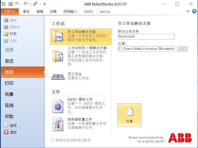 1、 开始之前先安装RobotStudio 6.01.01和RobotWare 5.15两个软件,安装好后打开RobotStudio 6.01.01,创建"空工作站解决方案";