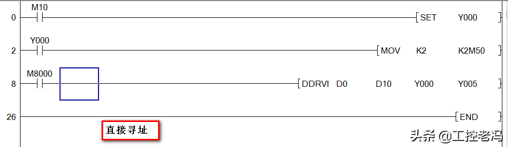 直接寻址:直接给出地址,基本逻辑指令都是直接寻址方式,功能指令中,大部分也都是直接寻址。比如下面这段程序就是直接寻址。
