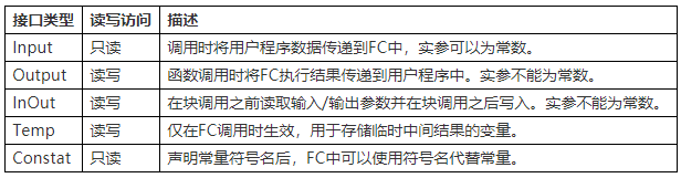 函数FC在使用时可以选择不带参数的FC和带参数的FC,若需要使用带参数的FC,那么在打开FC后,需要在FC的接口定义相关的接口参数,调用函数FC时需要给FC的所有形参分配实参。接口区的各个参数含义如下图。