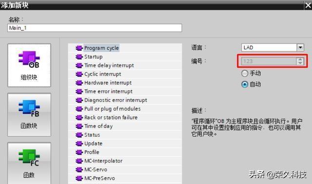 程序循环事件OB块(program cycle):该块主要用于执行循环运行的程序,一般一个程序中创建一个便可以,就是默认的Main程序(OB1),我们可以通过调用FC和FB来实现其他功能。系统CPU每个扫描周期都会执行该类型OB块。
