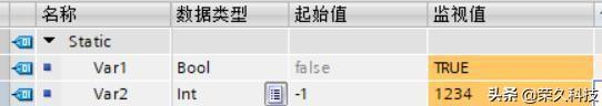 启动事件OB块(Startup):该块主要用于初始化变量,当PLC断电重启或者CPU从STOP切换为RUN时候执行,往后不再运行,也就是只运行一次。我们新建一个DB1块,添加两个,设置初始值,如下图所示: