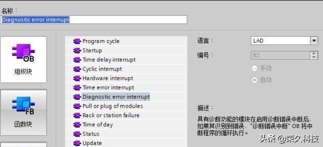 诊断错误事件OB块(Diagnostic error interrupt):当PLC发生故障时,会触发该事件;解除故障时,也会触发该事件,在该模块里面,我们可以读到故障信息。