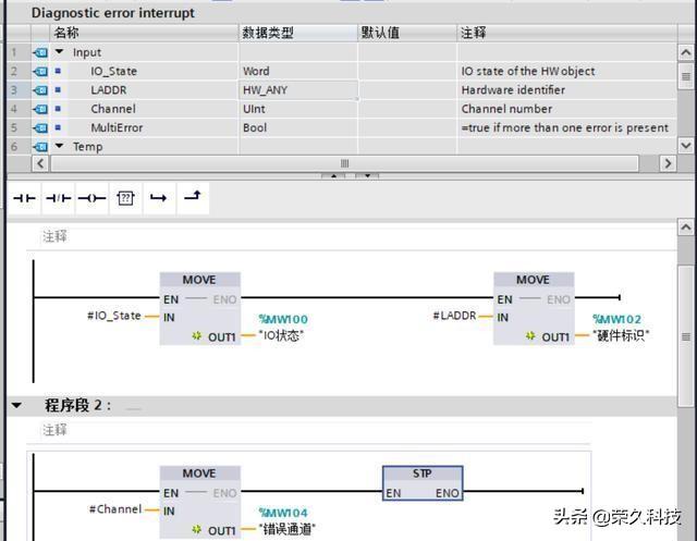 在诊断程序中,我们可以获取错误IO状态,硬件标识符和通道,并添加了STP指令。当错误发生时候,使PLC处于STOP状态,若不添加STP指令,PLC仍以RUN状态运行。