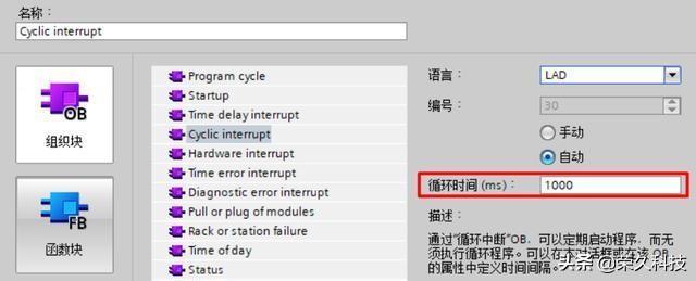 循环中断事件OB块(Cyclic interrupt):常常用于需要定时执行的任务,比如我们需要1秒钟采样50个模拟值,我们可以把循环时间设置为20毫秒。可能会有人问,为什么不采用普通定时器每隔20毫秒采样一次呢?因为普通定时器会受到CPU扫描周期的影响。在PID程序中,我们需要采用循环中断事件来调整计算PID输出。