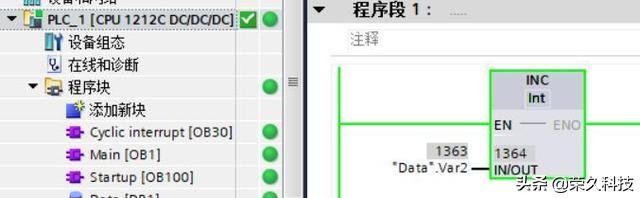 我们会看到在OB30这个程序块里面,"Data".Var2的值会每隔1秒变化,如果把INC指令放在Main[OB1]里面会是什么情况呢?