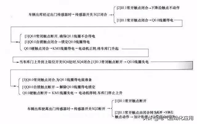 在车辆出库经过出门传感器时,出门传感器开关闭合,车库门电动机正转,车库门上升,当门上升到上限位开关处时,电动机停转;车辆出库经过入门传感器时,入门传感器开关闭合,车库门电动机反转,车库门下降,当门下降到下限位开关处时,电动机停转。