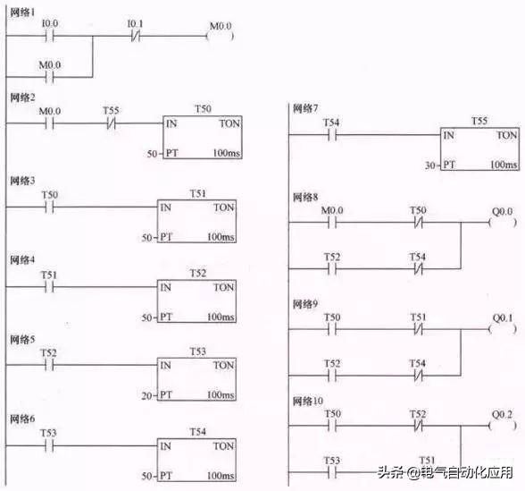 在上图所示的梯形图中,采用了一个特殊的辅助继电器SM0.5,称为触点利用型特殊继电器,它利用PLC自动驱动线圈,用户只能利用它的触点,即画梯形图里只能画它的触点。SM0.5能产生周期为1s的时钟脉冲,其高低电平持续时间各为0.5s,以上图梯形图网络9为例,当T50常开触点闭合,在1s内,SM0.5常闭触点接通、断开时间分别为0.5s,Q0.4线圈得电、失电时间也都为0.5s。