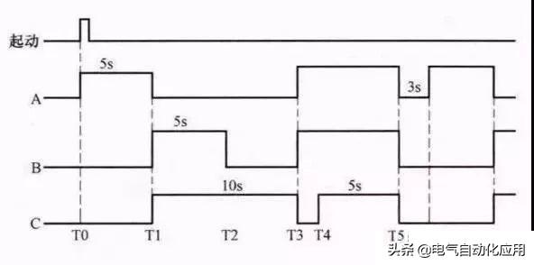 当按下起动按钮后,A组喷头先喷5s后停止,然后B、C组喷头同时喷,5s后,B组喷头停止、C组喷头继续喷5s再停止,而后A、B组喷头喷7s,C组喷头在这7s的前2s内停止,后5s内喷水,接着A、B、C三组喷头同时停止3s,以后重复前述过程。按下停止按钮后,三组喷头同时停止喷水。下图为A、B、C三组喷头工作时序图。