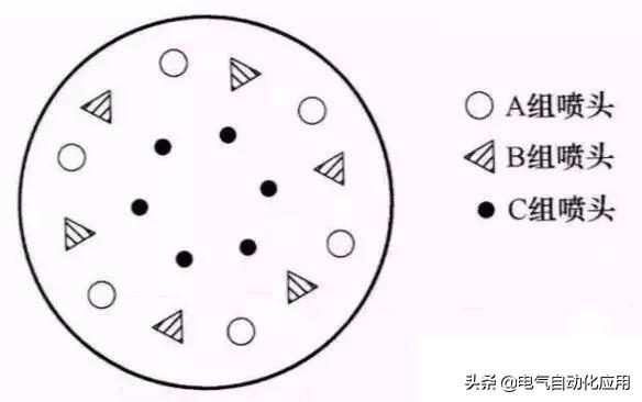 系统要求用两个按钮来控制A、B、C三组喷头工作(通过控制三组喷头的泵电动机来实现),三组喷头排列如下图所示。