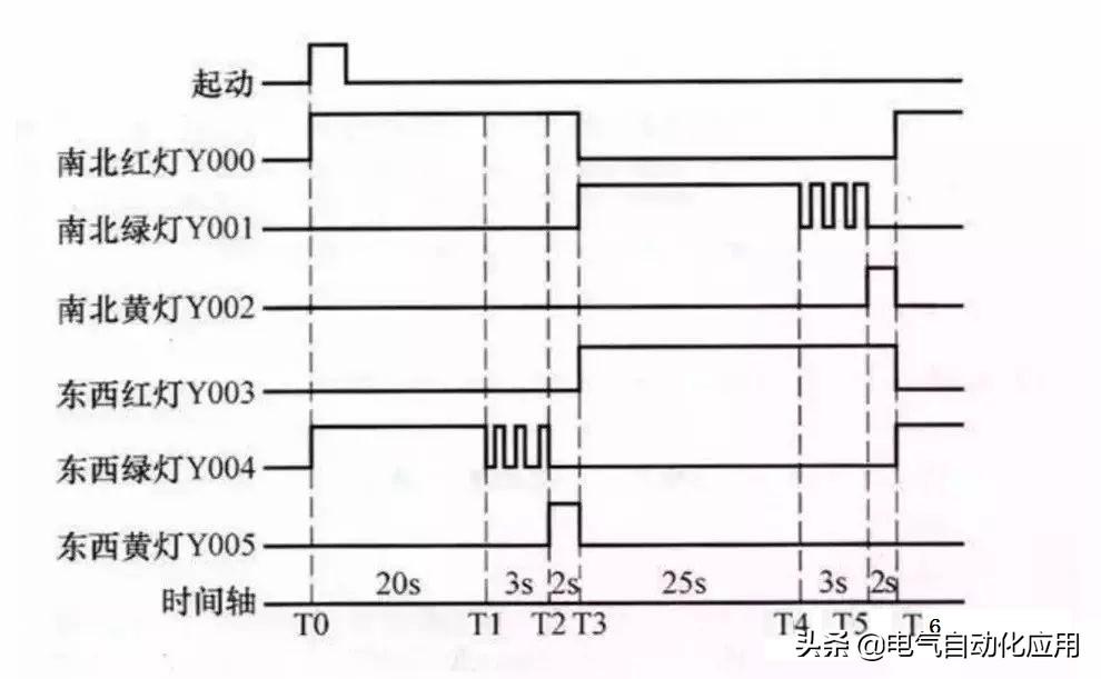 当按下起动按钮后,南北红灯亮25s,在南北红灯亮25s的时间里,东西绿灯先亮20s再以1次/s的频率闪烁3次,接着东西黄灯亮2s,25s后南北红灯熄灭,熄灭时间维持30s,在这30s时间里,东西红灯一直亮,南北绿灯先亮25s,然后以1次/s频率闪烁3次,接着南北黄灯亮2s。以后重复该过程。按下停止按钮后,所有的灯都熄灭。交通信号灯的工作时序如下图所示。