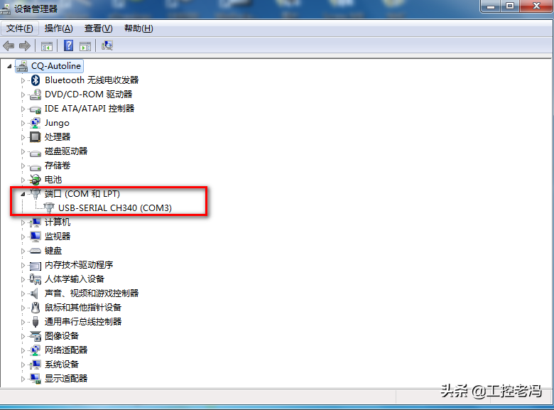 给PLC插编程电缆的时候要注意针孔位置,切记不可用蛮力。给PLC上电后,我们右键我的电脑,选择属性,再点击设备管理器。就可以看到我们插入的是哪个com口了。我这里是com3。