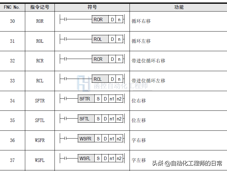 在使用PLC编程的过程中,做一些循环的工作或者移位的工作,PLC的循环移位指令可以使这类工作变得简单容易。如下表是PLC的循环移位类指令: