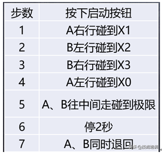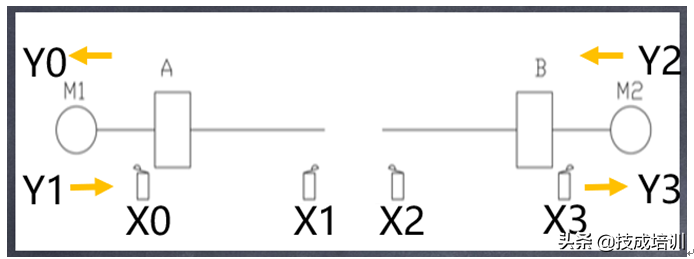 如下图,有两台电机M1、M2,分别能够控制A、B两个平台进行左移右移动作,每个平台都有左右限位,具体I/O分布如表所示