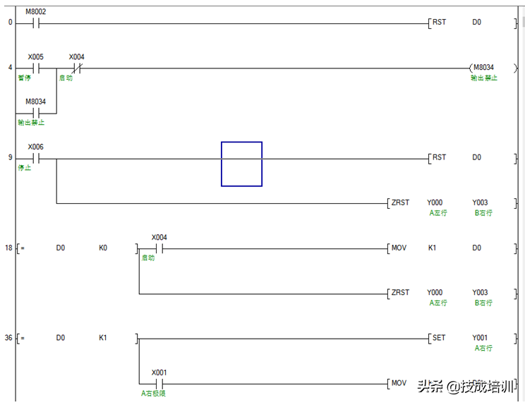 上图中的红色文字指的是步号,第一步是A右行,第二步是B左行,我们可以用一个数据寄存器D0对其动作进行记录,用MOV指令进行给定。比如按下X4按钮时,用mov指令给寄存器D0传送一个K1的数值,表示进入了第一步,这些。用等于指令,当D0等于1时,输出Y1的动作,让A平台右行。