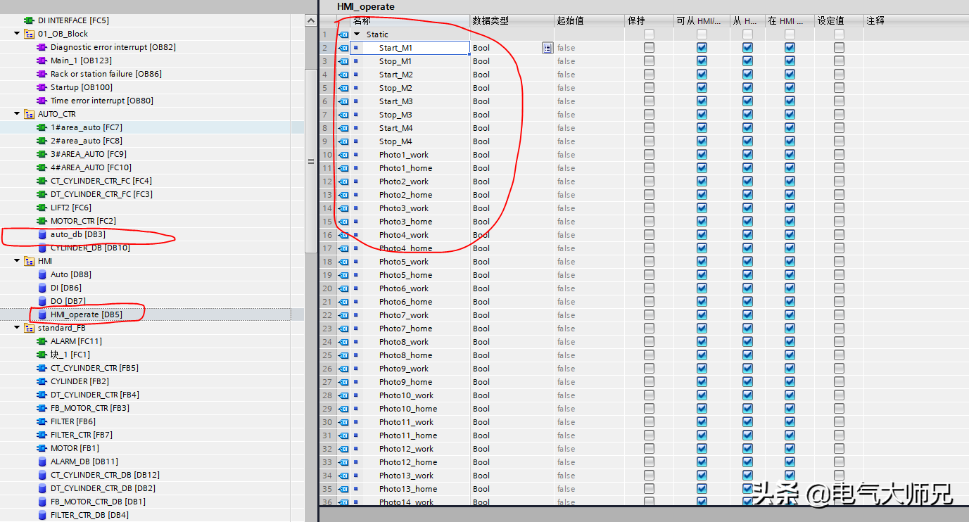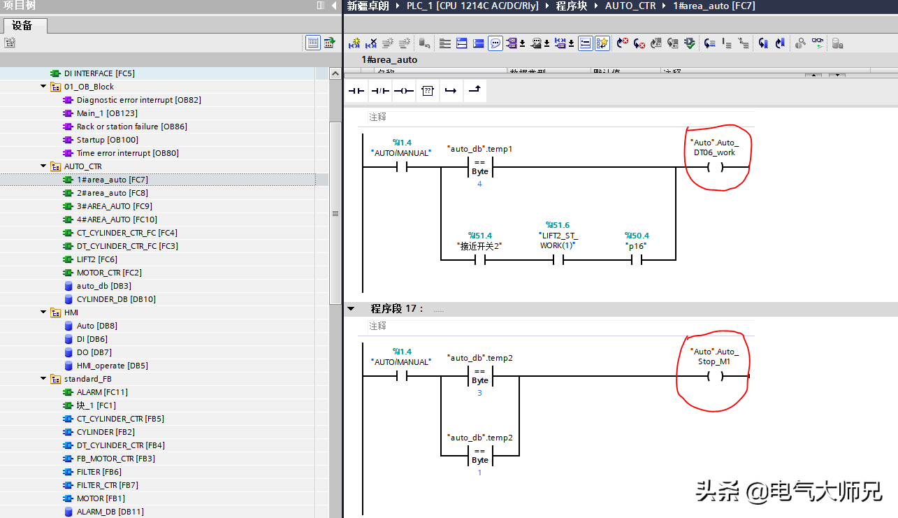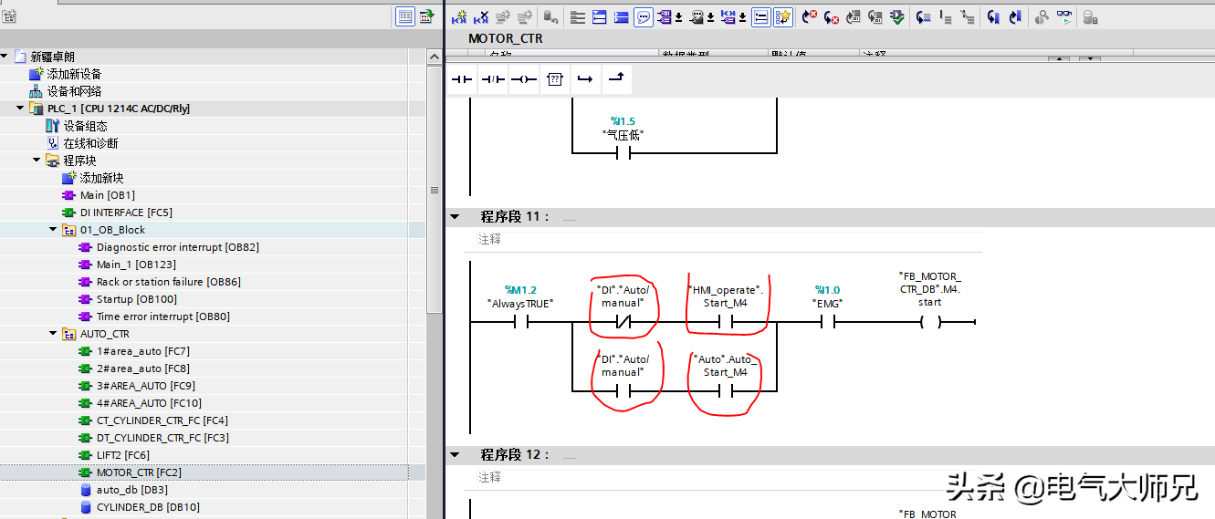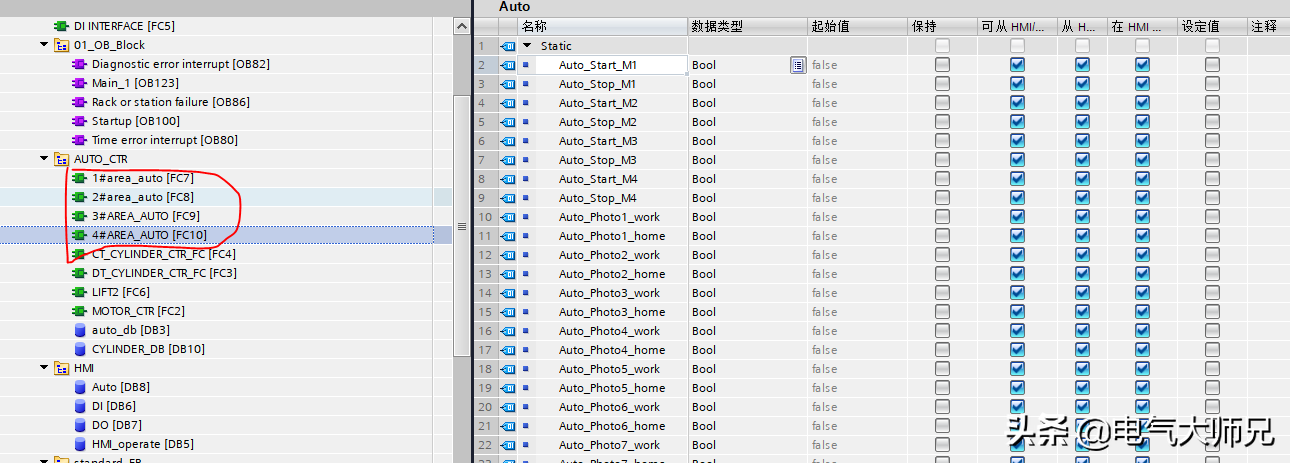 其中手动变量连接的是上位机触摸屏的变量,这样达到手动模式,就可以直接控制执行元件的动作,如果自动模式下,我们建立自动控制程序,如下图所示,每个区域分成一个FC块,这样更容易区分建立FC自动控制块