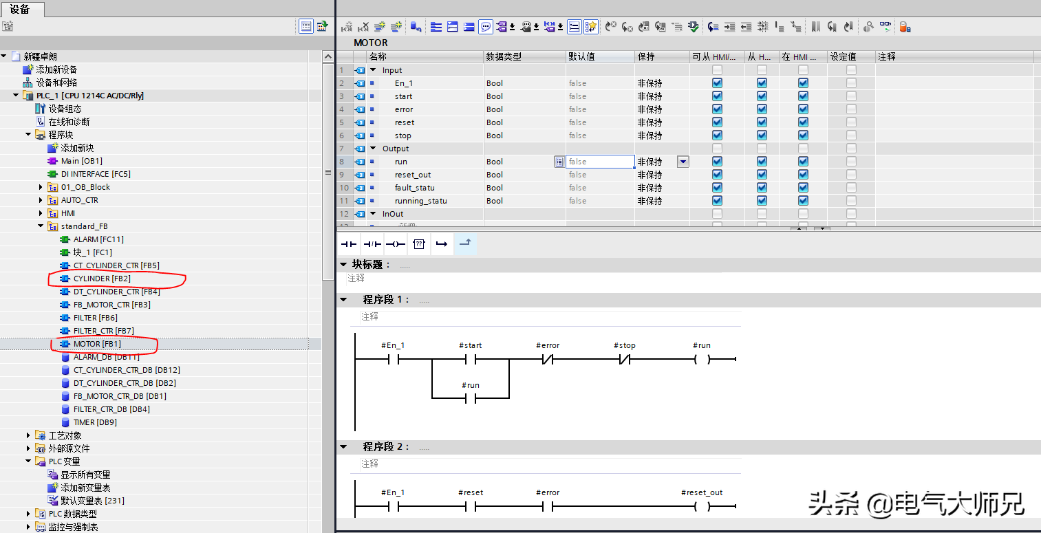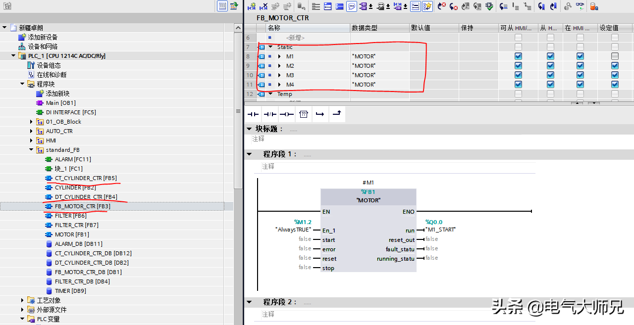 接着就可以做多个重复功能的FB功能块,如电机、气缸和多个重复功能的,例如本例子中我们有4个电机、8个气缸,先建立两个FB块,FB1/MOTOR和FB2/CYLINDER,这两个程序块如何编写,这篇文章就不赘述,我们今天就谈框架。建立基础功能块