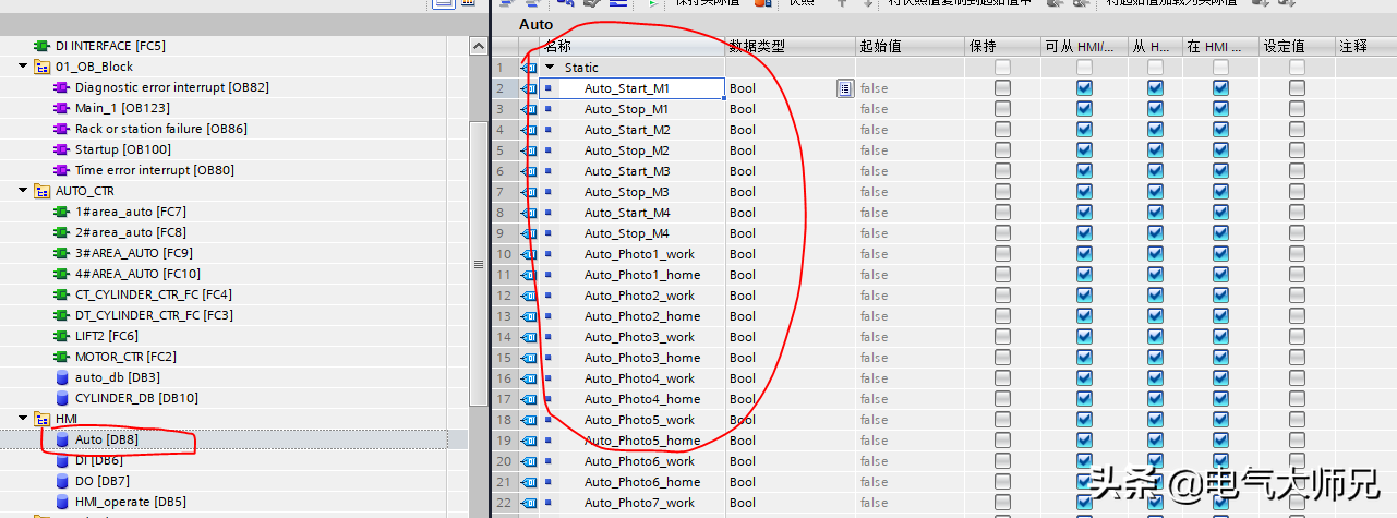 在自动逻辑中输出自动程序变量连接FB调用块中的对应变量即可自动控制,自动程序如何写,我们今天不做赘述。整个程序的流程框架基本上如此,再加上一些报警的控制和显示,完成任务!